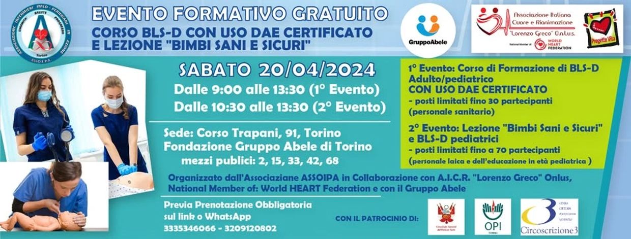 Organizzata da ASSOIPA in collaborazione con A.I.C.R – Associazione Italiana Cuore e Rianimazione “Lorenzo Greco O.N.L.U.S.” della World Heart Federation e della Fondazione Gruppo Abele con il patrocinio del Consolato Generale del Perù di Torino, della fondazione Gruppo Abele, Circoscrizione 3 di Torino e dell’OPI di Torino (Ordine Professione Infermieristiche) con i professionisti e istruttori dell’AICR, finalizzato all’acquisizione delle procedure di primo soccorso Base + Avanzato che comprendono la rianimazione cardiopolmonare e una sequenza di azioni di supporto di base alle funzioni vitali. L'espressione BLS-D si riferisce al protocollo BLS con l'aggiunta dell'utilizzo del defibrillatore (DAE).